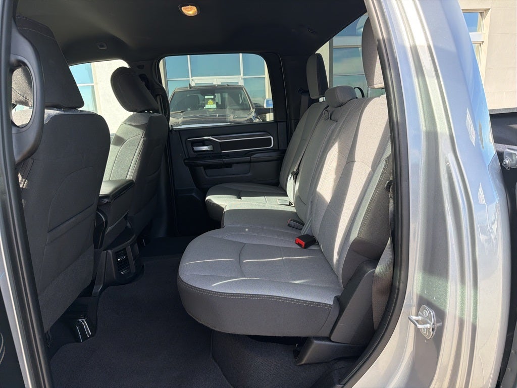 Bed Utility Group (LED Bed Lighting, MOPAR Deployable Bed Step, and MOPAR Spray In Bedliner), Protection Group (Tow Hooks), Quick Order Package 2GZ Big Horn, 2 Way Rear Headrest Seat, 3.73 Axle Ratio, 4 Way Front Headrests, 4-Wheel Disc Brakes, 40/20/40 Split Bench Seat, 6 Speakers, ABS brakes, Active Noise Control System, Air Conditioning, Anti-Spin Differential Rear Axle, Black Exterior Mirrors, Bluetooth® Handsfree Phone & Audio, Brake assist, Bumpers: chrome, Center Hub, Center Stack Storage Drawer, Chrome Flat Cab-Length Side Steps, Cloth 40/20/40 Bench Seat, Compass, Connectivity - US/Canada, Delay-off headlights, Driver door bin, Dual front impact airbags, Dual front side impact airbags, Electronic Stability Control, Electronically Controlled Throttle, Emergency communication system: SiriusXM Guardian, Exterior Mirrors w/Heating Element, Front anti-roll bar, Front Center Armrest w/Storage, Front Fog Lamps, Front License Plate Bracket, Front reading lights, Fully automatic headlights, Global Telematics Box Module (TBM), GPS Antenna Input, Heated door mirrors, Illuminated entry, Integrated Center Stack Radio, Integrated Voice Command w/Bluetooth®, Low tire pressure warning, Manual Adjust 4-Way Driver Seat, Manufacturer's Statement of Origin, Occupant sensing airbag, Outside temperature display, Overhead airbag, Overhead console, Panic alarm, ParkView Rear Back-Up Camera, Passenger door bin, Passenger vanity mirror, Power 2-Way Driver Lumbar Adjust, Power Adjust Mirrors, Power door mirrors, Power steering, Power windows, Radio data system, Radio: Uconnect 3 w/5 Display, Radio: Uconnect 5 W w/8.4 Display, Rear anti-roll bar, Rear Folding Seat, Rear seat center armrest, Rear step bumper, Remote keyless entry, SiriusXM Radio Service, Speed control, Tachometer, Tilt steering wheel, Tip Start, Traction control, Trip computer, Turn signal indicator mirrors, Variably intermittent wipers, Voltmeter, and Wheels: 18 x 8.0 Steel Chrome Clad.